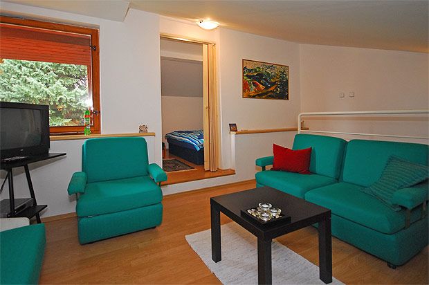 Podkrovní část také obsahuje prostornou ložnici, dalším pokojem je obývací pokoj, kde se nachází prostorný gauč a TV se satelitem.